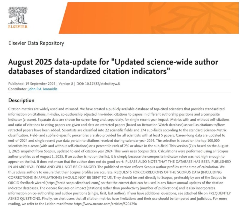 2025-09-269月19日,爱思唯尔数据库(Elsevier Data Repository)和美国斯坦福大学发布了第八...